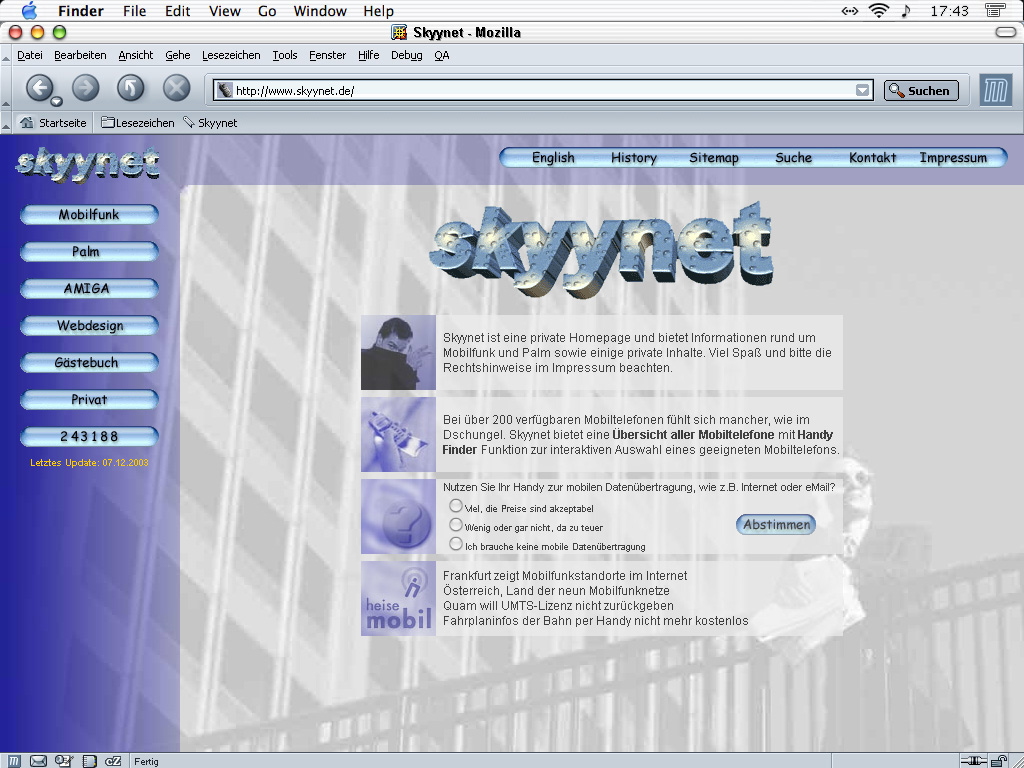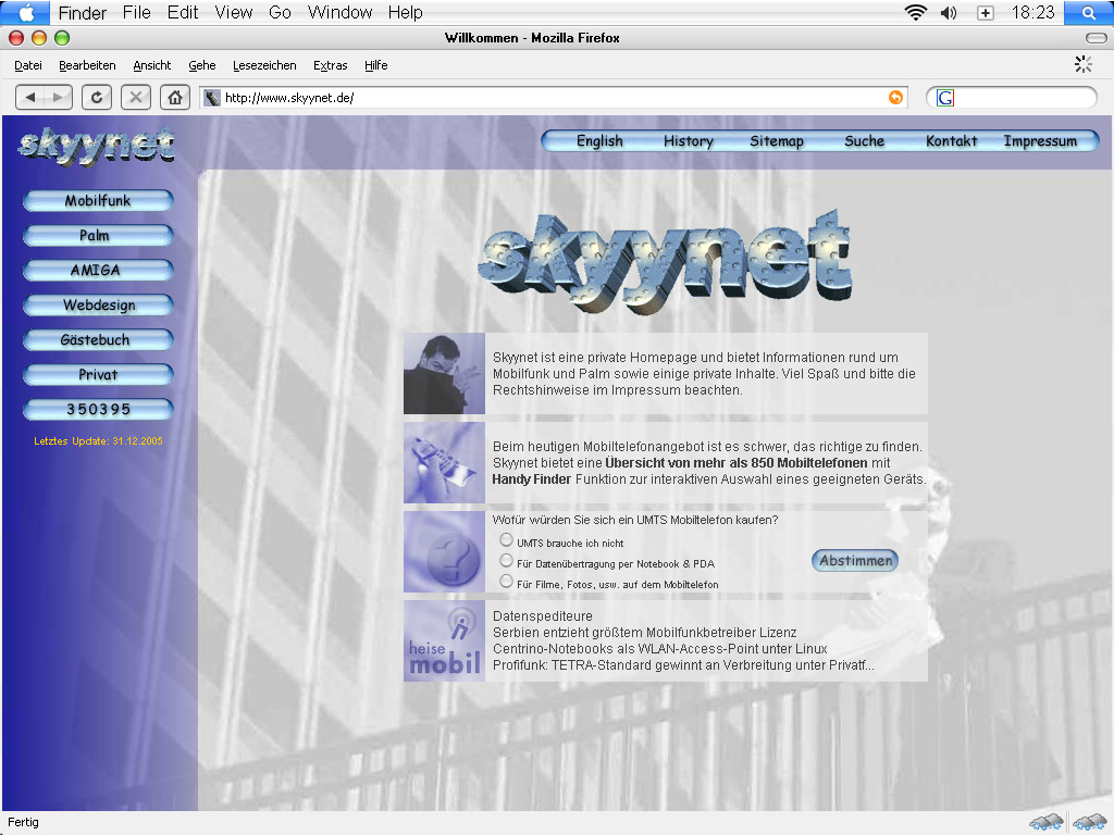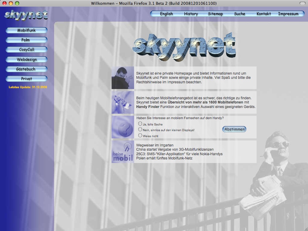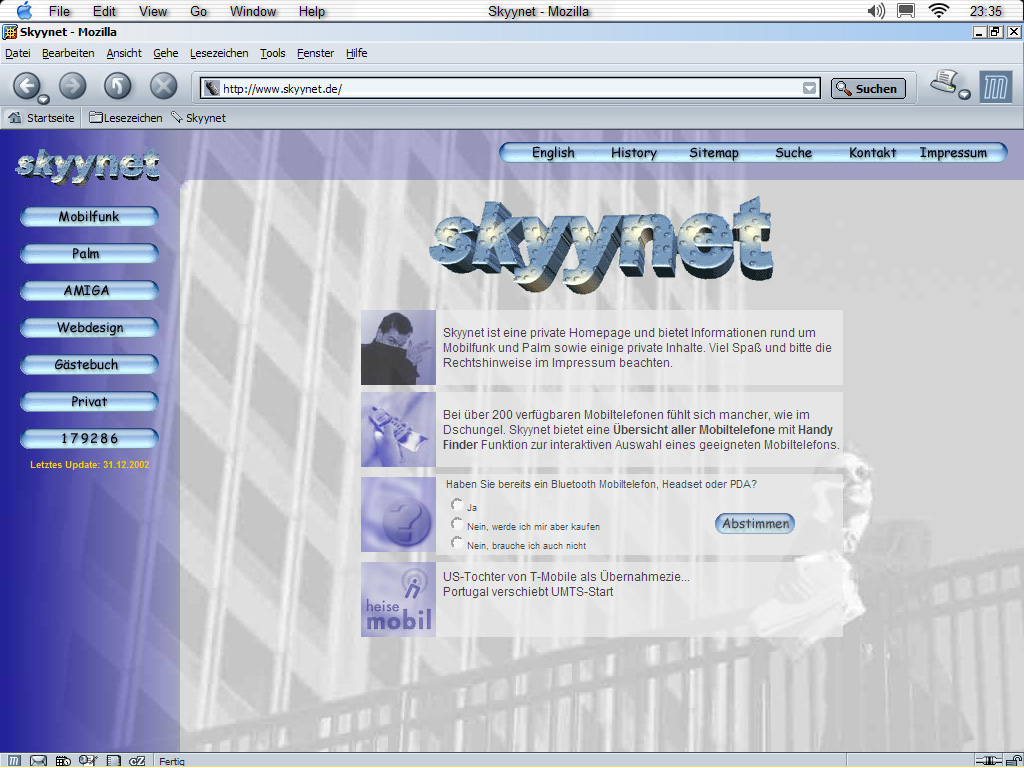 16.12.2002 Neues alternatives Stylesheet mit größerer Schrift, z.B. für Sehschwache. Aufrufbar in allen gemäß W3C Empfehlung programmierten Browsern (z.Zt. also nur Mozilla und Netscape 7) per Menü "VIEW > USE STYLE > SKYYNET BIG" 24.06.2002 Neue, selbst programmierte, Umfrage auf der Homepage 31.12.2001