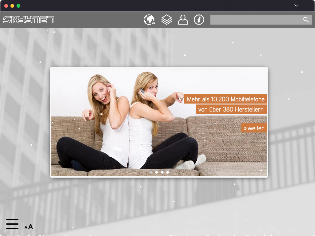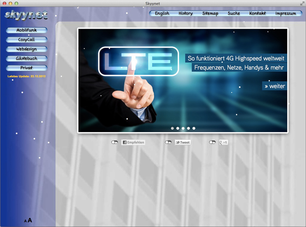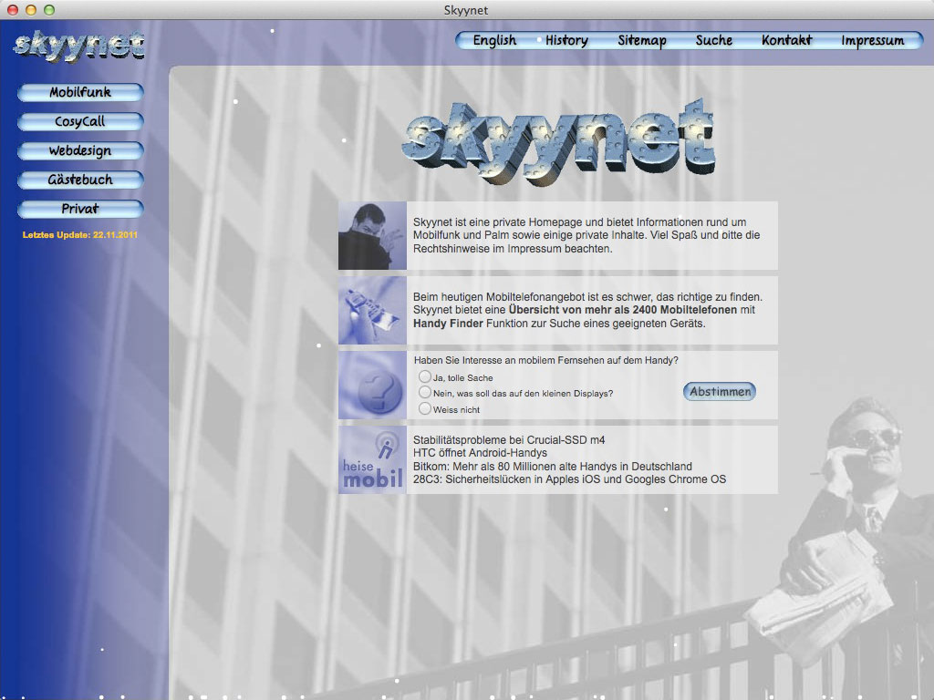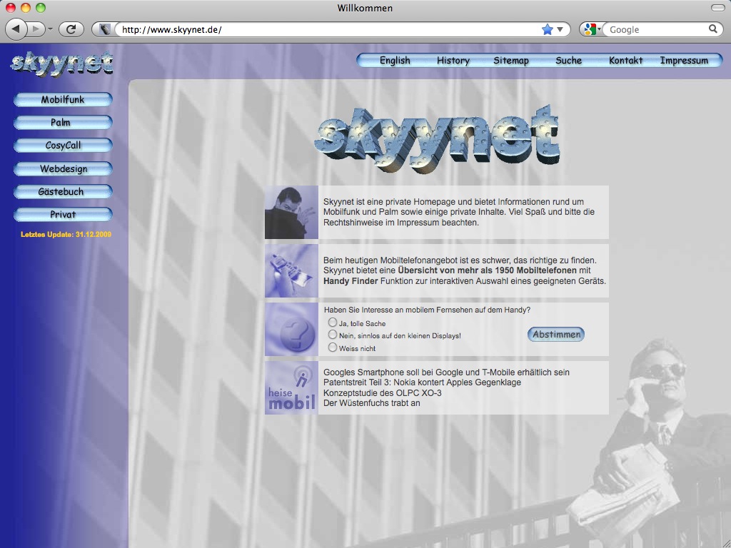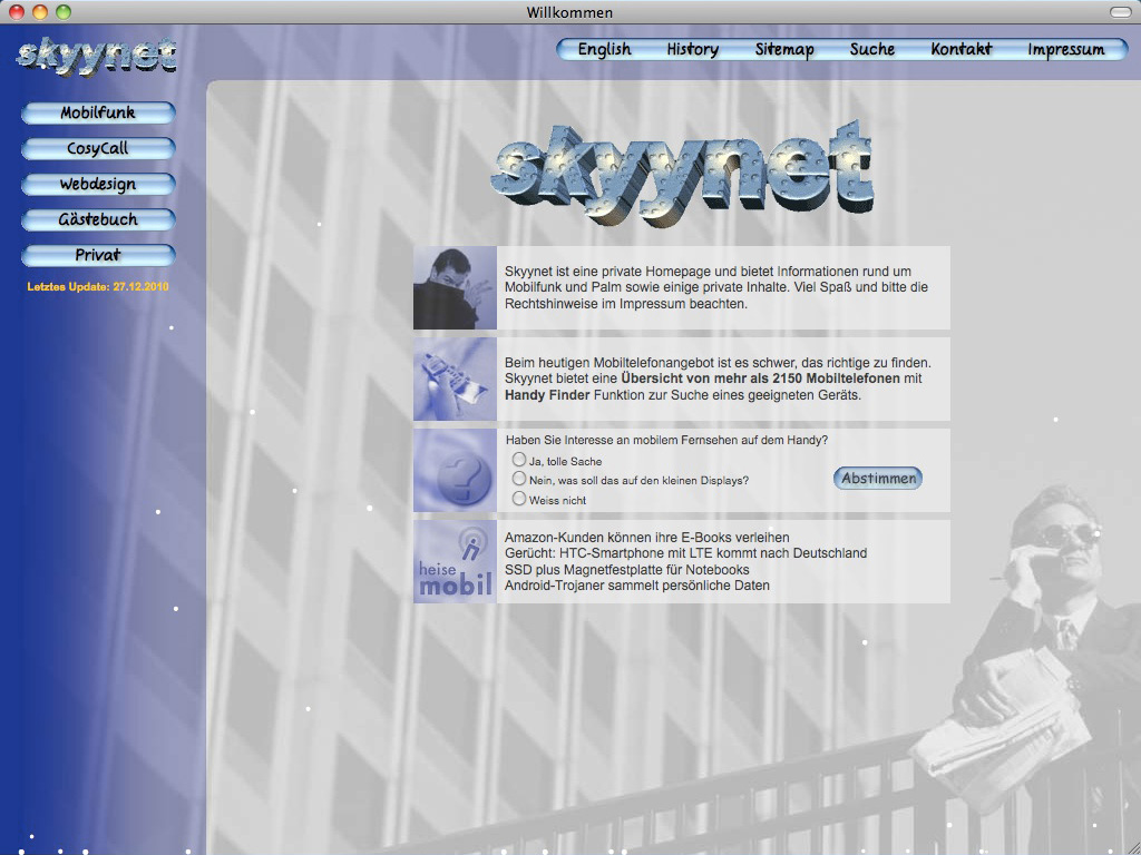 16.12.2002 Neues alternatives Stylesheet mit größerer Schrift, z.B. für Sehschwache. Aufrufbar in allen gemäß W3C Empfehlung programmierten Browsern (z.Zt. also nur Mozilla und Netscape 7) per Menü "VIEW > USE STYLE > SKYYNET BIG" 24.06.2002 Neue, selbst programmierte, Umfrage auf der Homepage 31.12.2001