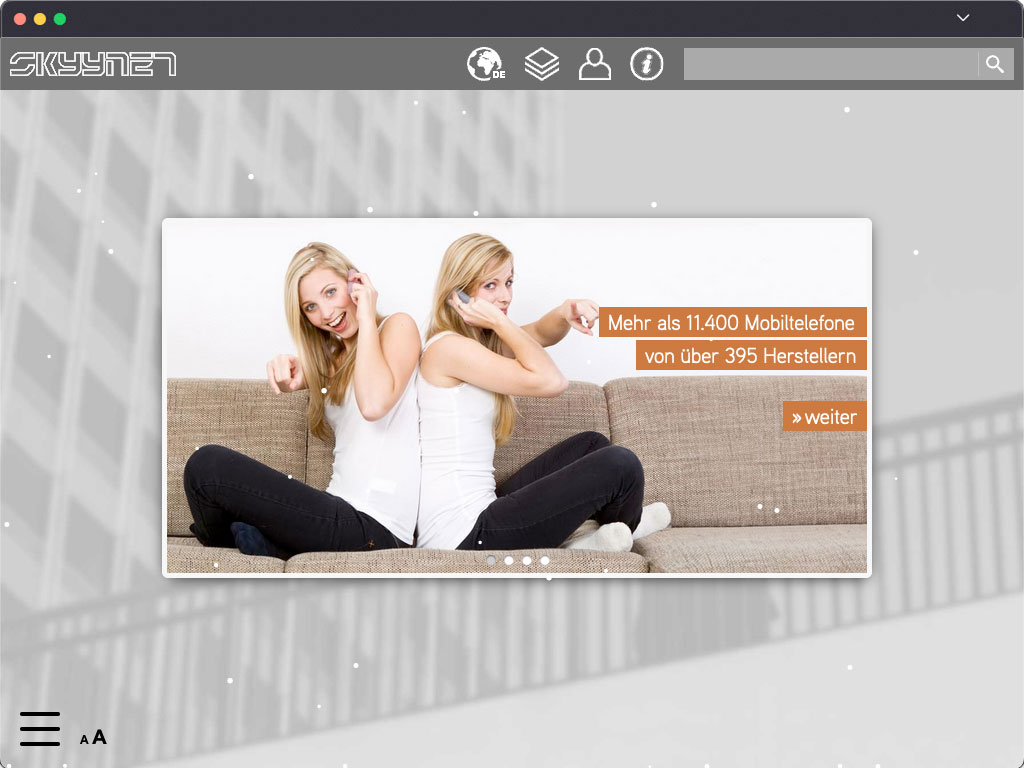 Umstellung der gesamten Homepage. Skyynet benutzt ab sofort keine Frames mehr und wird optimal mit einem CSS2 fähigen Browser, wie Mozilla 1.6, Netscape 7.1, Opera 7.23 oder Safari 1.2 dargestellt. Leider mußte für den Internet Explorer ein Workaround erstellt werden, da dieser mit absoluter Positionierung erhebliche Probleme hat.