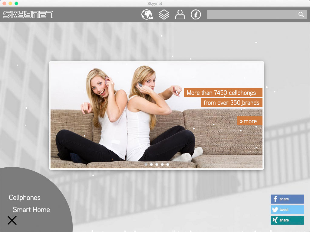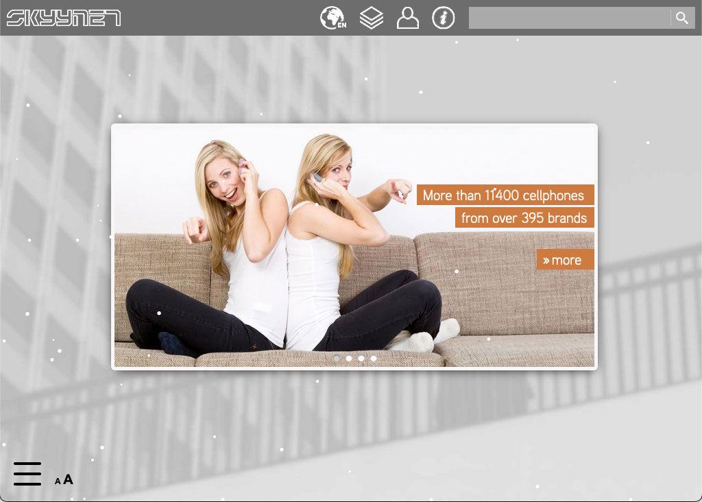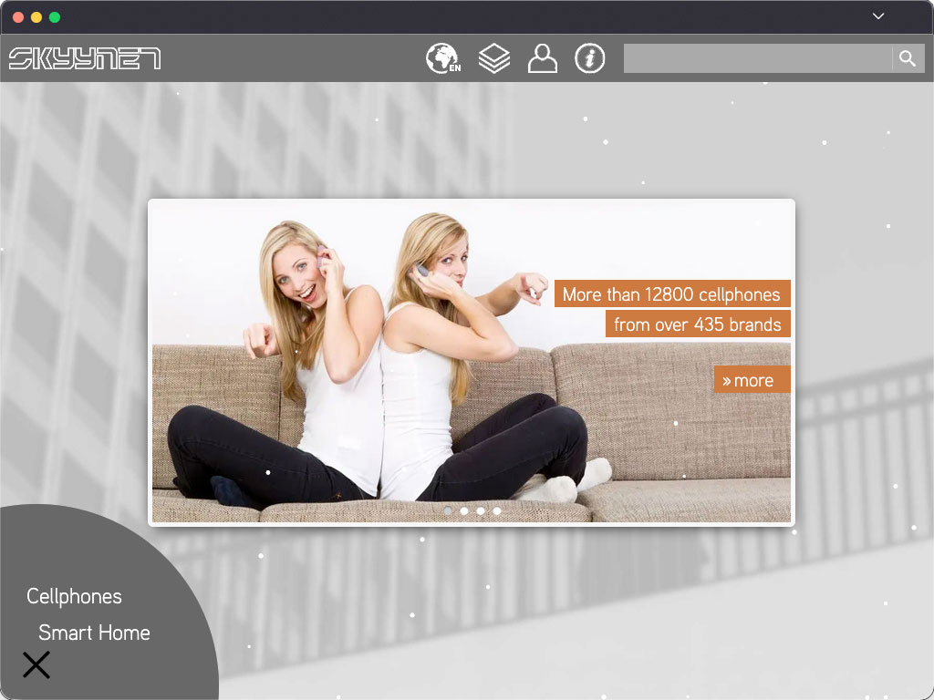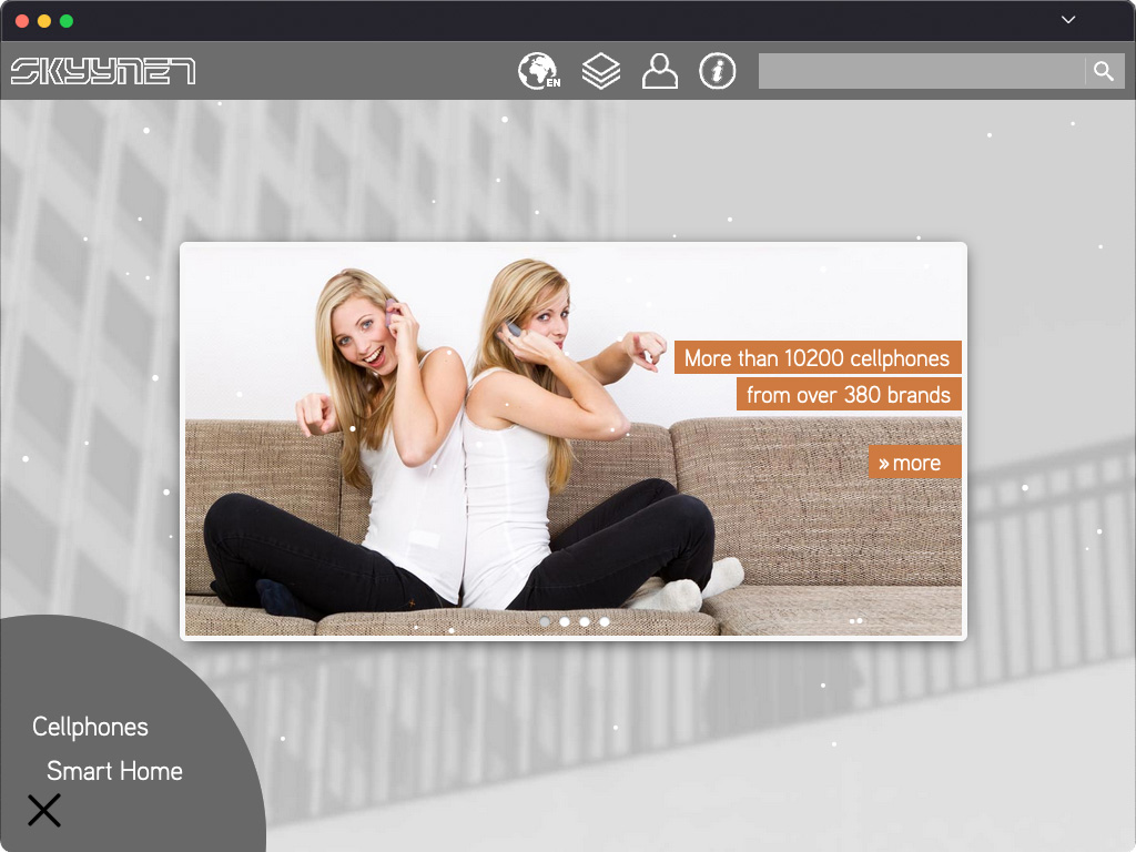 Conversion of the complete homepage. Skyynet does not use frames anymore and is best used with a CSS2 capable browser, like Mozilla 1.6, Netscape 7.1, Opera 7.23 or Safari 1.2. Unfortunately a workaround had to be programmed for Internet Explorer due to its major problems concerning absolute positioning.