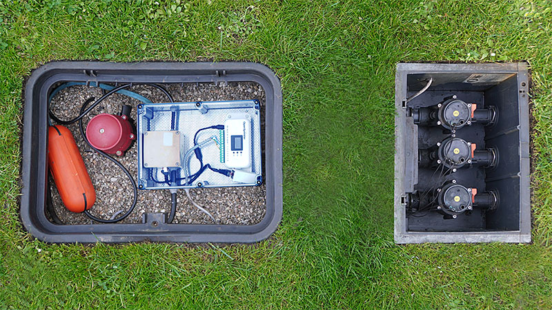 werden können, geht das Wasser von der Pumpe in einen Ventilkasten, wo drei Stränge