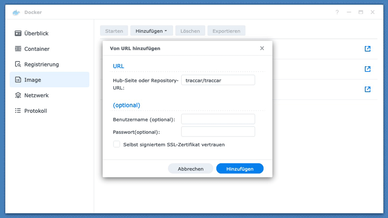 ausgewählt. Nach dem Download muss man unter Image auf traccar/traccar:latest