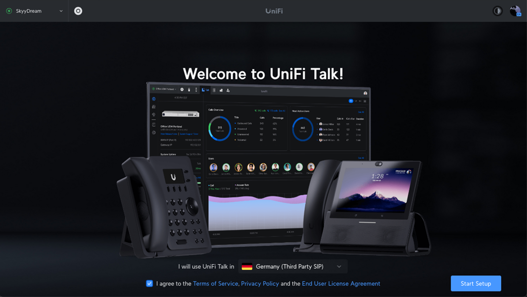 Land Deutschland wählen. Nach Klick auf Start Setup wir das angeschlossene UniFi Phone