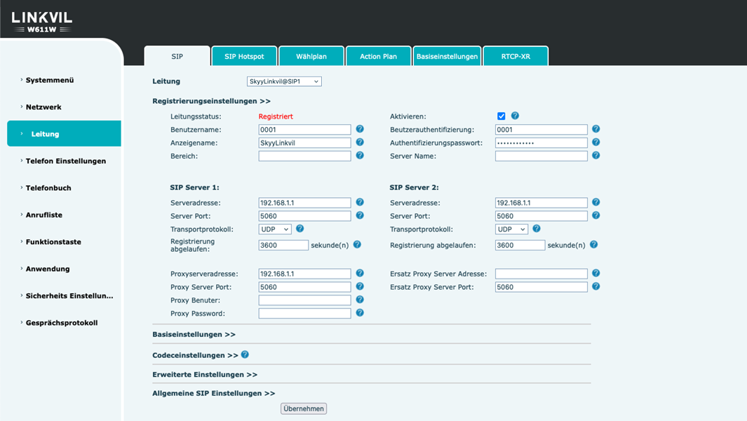 unterschiedlich. Als Benutzername ist die vierstellige interne Rufnummer und die IP der
