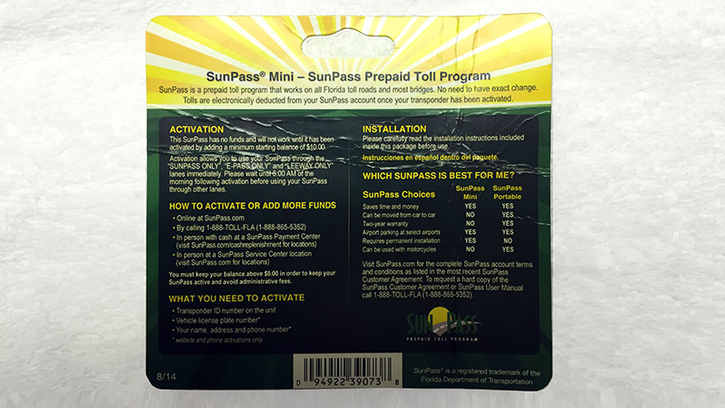 der SunPass Mini ein kreditkartengroßer Aufkleber, der nur $5 kostet. Erhältlich
